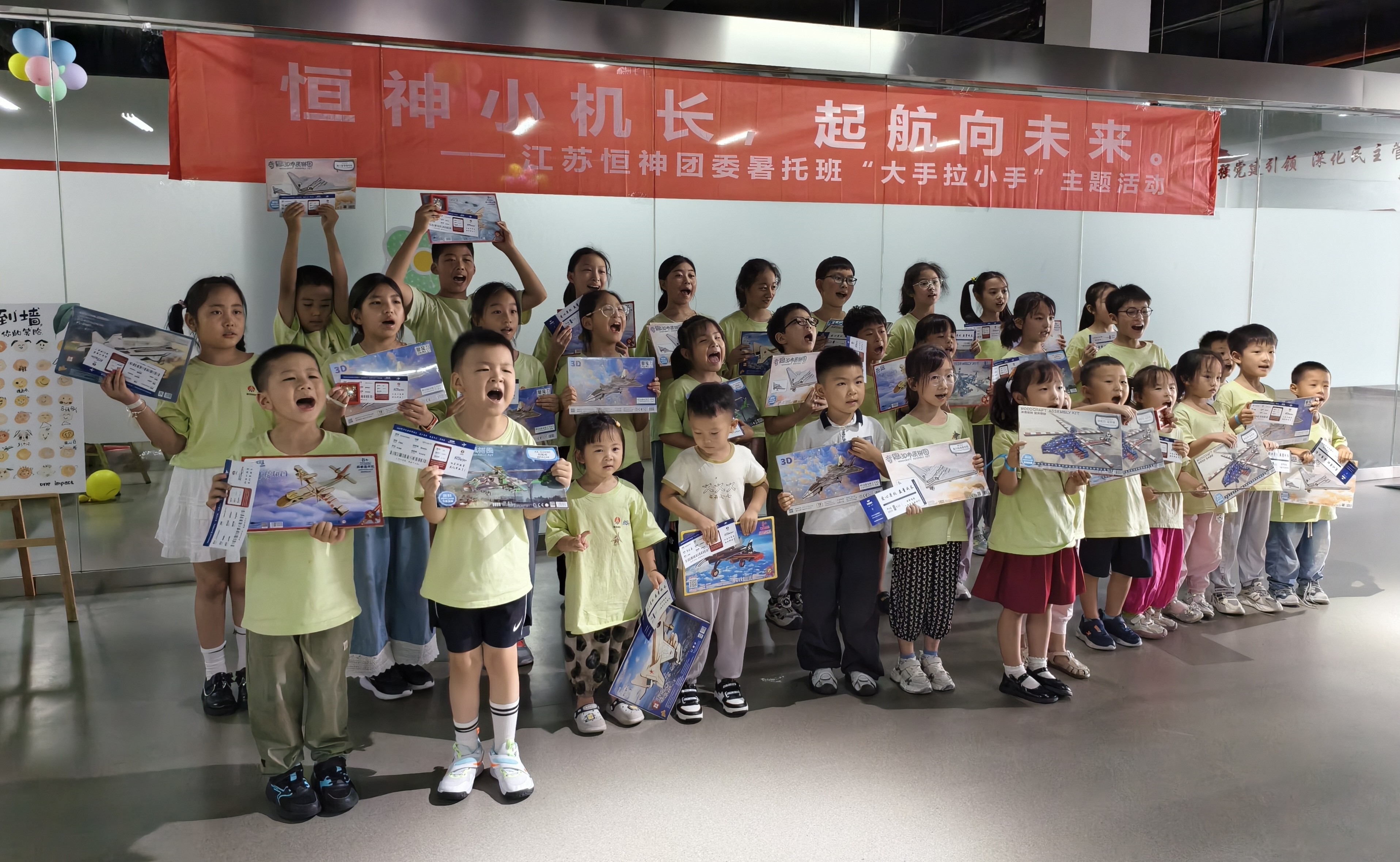 8月12日下午,恒神股份愛心暑托班的活動場地變身歡樂航空港,約50名職工子女化身 “恒神小機長”,在團委青年們的帶領(lǐng)和陪伴下,開啟了一場充滿歡笑與成長的航空主題奇妙之旅。這場以 “恒神小機長?起航向未來” 為主題的趣味游戲活動,讓孩子們在輕松愉快的游戲中收獲了知識、初步建立了團隊互助協(xié)作的觀念。開場破冰:舞蹈牽情誼,小隊齊集結(jié)隨著歡快的音樂旋律響起,活動正式拉開帷幕。5名團委青年與孩子們手拉手圍成圈,跟著節(jié)奏蹦跳旋轉(zhuǎn),原本有些靦腆的小朋友們很快被活潑的氛圍感染,大廳里瞬間充滿了銀鈴般的笑聲。這場破冰舞蹈就像一根無形的線,迅速拉近了青年志愿者與孩子們的距離。在簡要的自我介紹后,大家通過抽取彩色手環(huán),分成了紅、黃、藍、綠、白五支小隊,展開了一場場趣味比拼。趣味闖關(guān):航空主題游戲里的知識與協(xié)作折紙飛機環(huán)節(jié)迅速點燃了孩子們的激情。大家拿著 A4 紙,跟著領(lǐng)隊老師學(xué)習(xí)折疊技巧,有的還別出心裁地畫上笑臉和花紋。“三、二、一,起飛!” 當數(shù)十架紙飛機穿過 “書架圓環(huán)” 時,大廳里爆發(fā)出陣陣歡呼。“我是拼圖小能手” 環(huán)節(jié)堪稱對 “速度與協(xié)作” 的考驗。當飛機拼圖被分發(fā)到各隊時,孩子們立刻圍坐在一起,七手八腳地開始拼接。“這塊應(yīng)該在這里!”“不對,看機翼的形狀!” 團委志愿者們在旁耐心引導(dǎo),既不包辦代替,又及時給迷茫的小隊員們支招。最終,各支隊伍都順利完成了拼圖任務(wù)。“飛機連連看” 游戲成了記憶力大比拼。孩子們盯著倒扣的紙牌,時而蹙眉思考,時而拍手歡呼,團委志愿者們則在一旁計時鼓勁、還要熱心的小朋友不時用掌聲鼓勵加油。最終,所有孩子都贏得了木制飛機模型拼圖,獲勝隊伍的小朋友還優(yōu)先挑選了心儀的款式。溫情收尾:徽章與機票見證成長,愛與理念扎根心間活動尾聲,每位小飛行員都領(lǐng)到了閃亮的 “恒神小機長” 徽章,驕傲地別在胸前。當印有每個孩子名字的 “結(jié)業(yè)機票” 被鄭重頒發(fā)時,不少小朋友舉著機票和模型向志愿者們開心地道謝。本次活動旨在讓職工子女在歡樂中感受航空精神,同時通過青年志愿者的陪伴,傳遞企業(yè)對員工家庭的關(guān)懷。這場持續(xù)兩小時的活動,像一根堅韌的 “情感碳纖維”,將企業(yè)、家庭與孩子緊緊相連。恒神團委的青年們用熱情與愛心,為孩子們的暑假添上了一抹明亮的色彩,也讓 “愛與未來一起飛” 的溫暖理念,深深扎根在每個人心中。